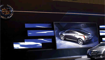 For the new Chevy Volt exhibit, BlueWater used 225 Barco MiTrix LED tiles to create media-integrated multiple vertical panels that stepped down to horizontal, forming a platform for the Volt chassis.