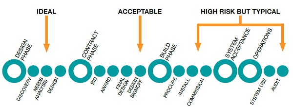 “Security requirements for AV projects are often discovered at installation or even worse, on commissioning or later when the organization runs a security audit." That's Harman Professional’s manager of Enterprise Solutions, Paul Zielie explaining how the cost and schedule impacts of discovering new critical requirements late in a project can be significant. "The illustration below shows a typical AV project timeline with various points at which security requirement discovery occurs,” he added.