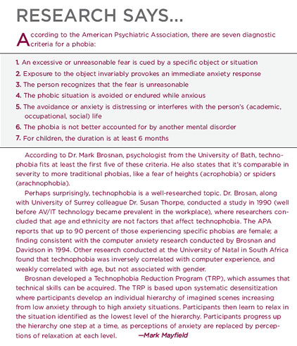 Technophobia probably goes back to the early days of telegraph and telephony. Its modern roots can be traced to the dawn of the personal computer. But advanced AV tools are fast becoming the new bogeyman for many who fear or resist technology. Even as AV puts the more practical and useful face on technology that everyone has sought by revolutionizing entertainment, education, and communication, to technophobes it's a whole new source of jitters.