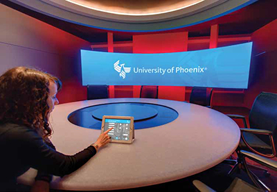 The University of Phoenix AV system is controlled wirelessly. Three channels of HD video are stored on an Alcorn McBride media. In the sales process, the “closer” is the person who seals the deal. They’re the one who makes the final pitch to the client in a way that makes the deal irresistible—perhaps impossible to refuse. At the University of Phoenix in Tempe, Arizona, the “closer” is actually a place, specifically the Executive Briefing Center (EBC) inside the new 8,000-square foot John G. Sperling Center for Educational Innovation. The Sperling Center is home to a stunning, walk-through AV tour created by 3Stage Design of Jasper, Georgia, that tells the University of Phoenix story to donors, dignitaries, and prospective students. Founded by the Apollo Group’s Dr. John Sperling in 1973, the University of Phoenix offers university degree programs at 112 campuses locations and worldwide over the Web.