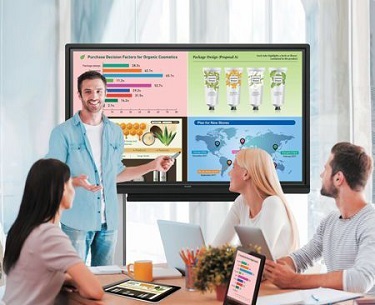 Users can connect with multiple mobile devices and simultaneously display the onscreen contents of those devices in a split screen. The display also readily integrates with select applications through Sharp strategic alliances.