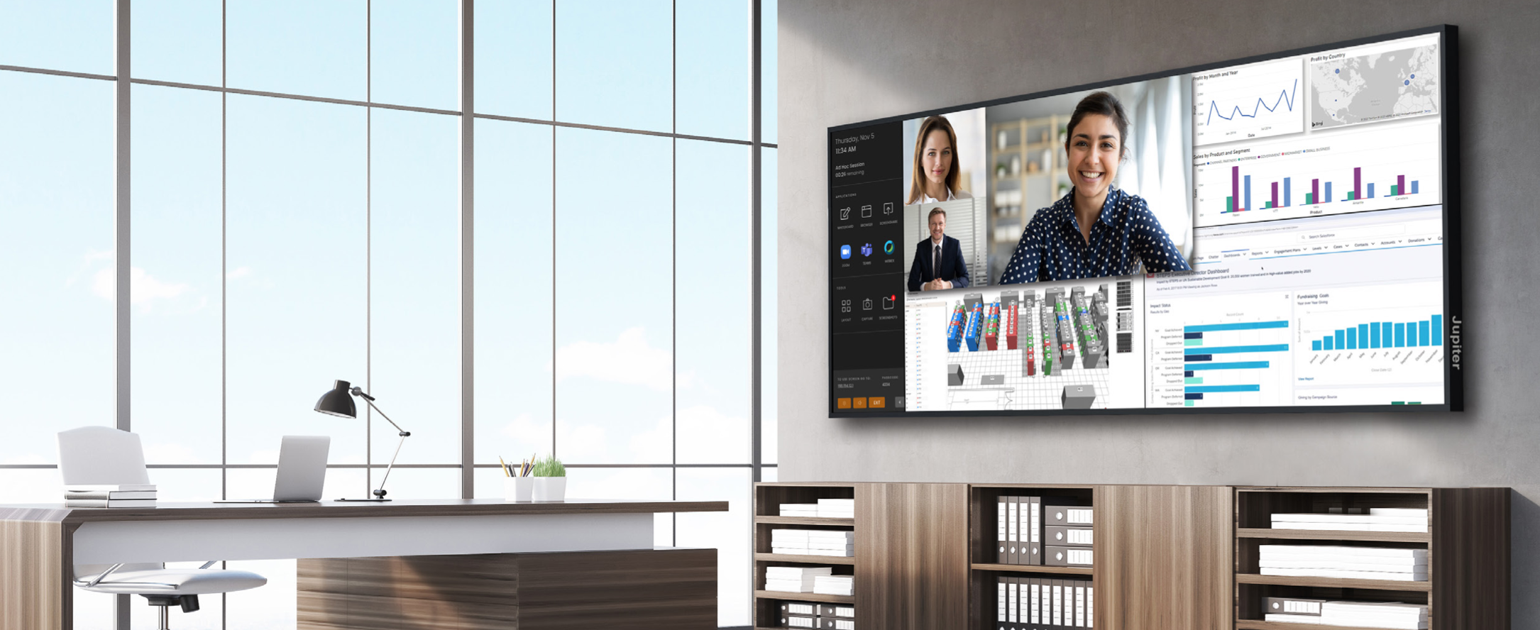 Jupiter’s Pana line of ultra-wide 21:9 5K large format LCD displays create an immersive experience, and 21:9 means more pixels, to the tune of 5120 by 2160, or 5K. That equates to 33 percent more screen space than 4K. With a bezel-less metal mesh capacitive touch display, Pana 81 supports 20 simultaneous touch points and is a gorgeous industrial design statement, a panoramic 5K beauty.