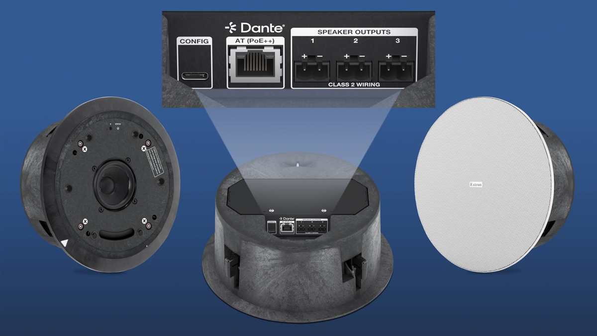 Extron introduced its first PoE speaker, the NF 4C LP. This 4-inch ceiling speaker system features scalable power, DSP, and Dante connectivity. Capable of driving up to three external passive speakers from its integrated four channel amplifier, the NF 4C LP is a single‑cable solution for individual zones within larger distributed ceiling speaker systems. Using Extron’s DSP Configurator Pro software, the integrated DSP can be set up independently for each amplifier channel with essential processing per zone. Dante Domain Manager and AES67 support ensure wide compatibility with enterprise configurations and other network audio devices.