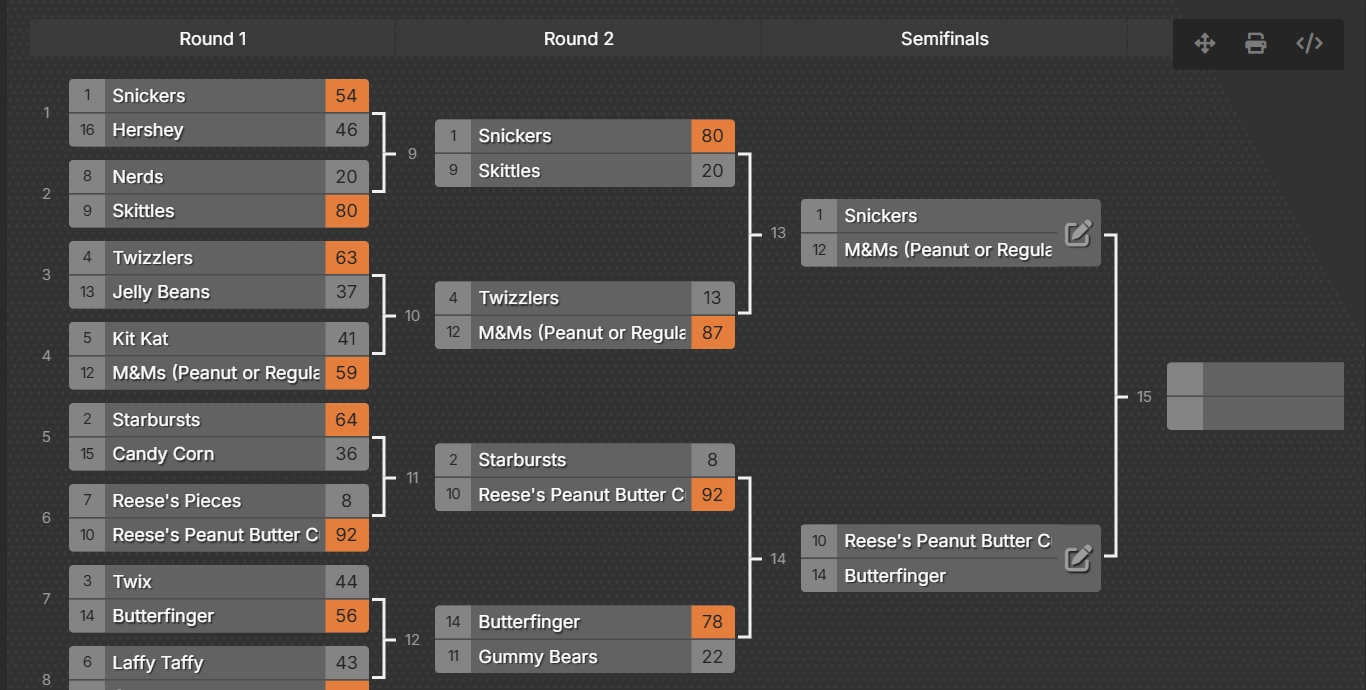 There are 16 teams (candies) broken down into two divisions (or flavors if you will): "Chocolate Town" and "Candy Crush." Eight of your favorite chocolate-based candies face off against each other, and then eight of your traditional ooey, gooey, yummy candies go at it until a winner from each division is crowned to face off in the finals.