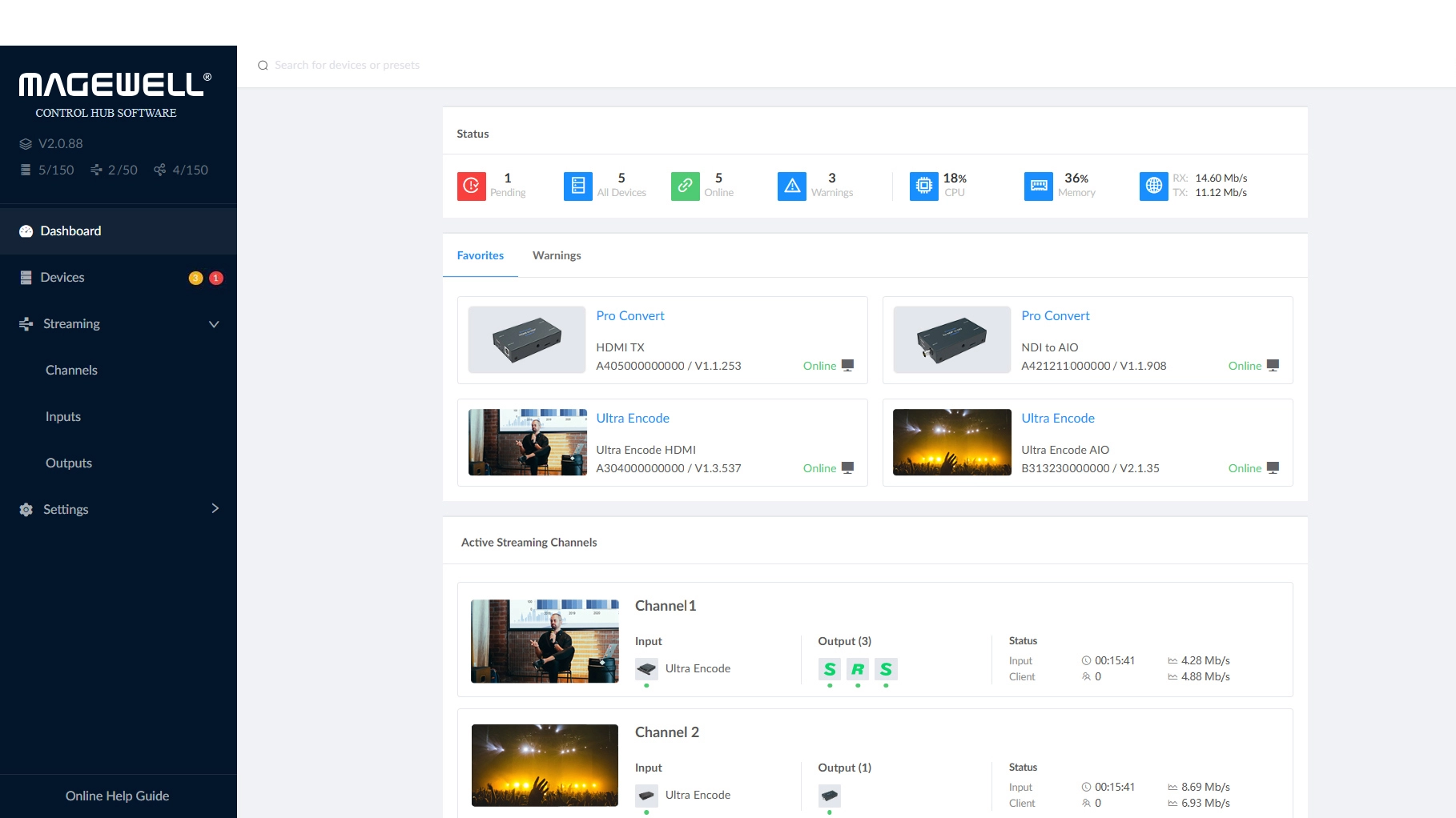 Three tiers of the full Control Hub software are available for purchase as perpetual licenses to meet customers’ specific needs for the number of managed devices, stream conversion channels and stream conversion outputs. Control Hub Basic offers management of up to 20 Magewell hardware devices and supports up to 5 stream conversion channels comprising a total of up to 20 outputs. For larger-scale deployments, Control Hub Plus supports up to 50 Magewell devices, 25 streaming channels and up to 50 total converted output streams, while Control Hub Pro supports 150 devices, 50 channels and 150 total conversion outputs.