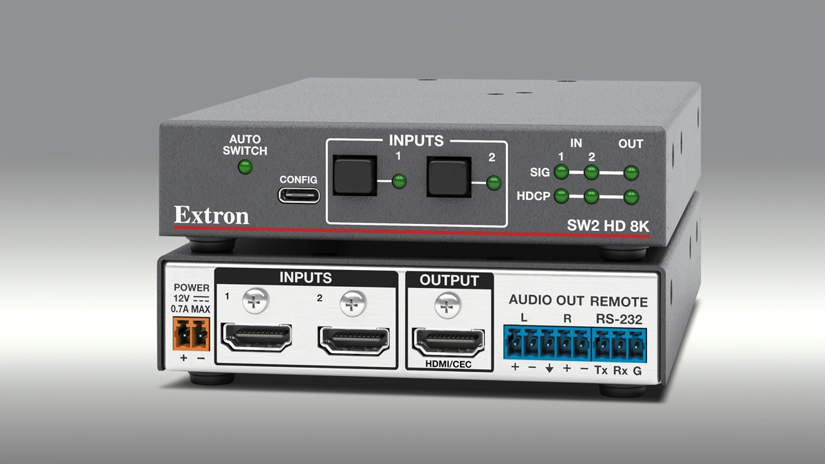 Extron unveiled its new SW2 HD 8K, a two-input HDMI switcher with analog audio de-embedding. Designed with system integrators in mind, this compact switcher delivers high-performance video and flexible audio integration for a wide range of AV environments. The switcher supports video resolutions up to 8K, including 21:9 and 5K ultra-wide aspect ratio content, delivering exceptional performance for next-generation AV systems. In addition to the HDMI output, an analog audio output provides extracted stereo HDMI signals to feed a sound system or other audio equipment.